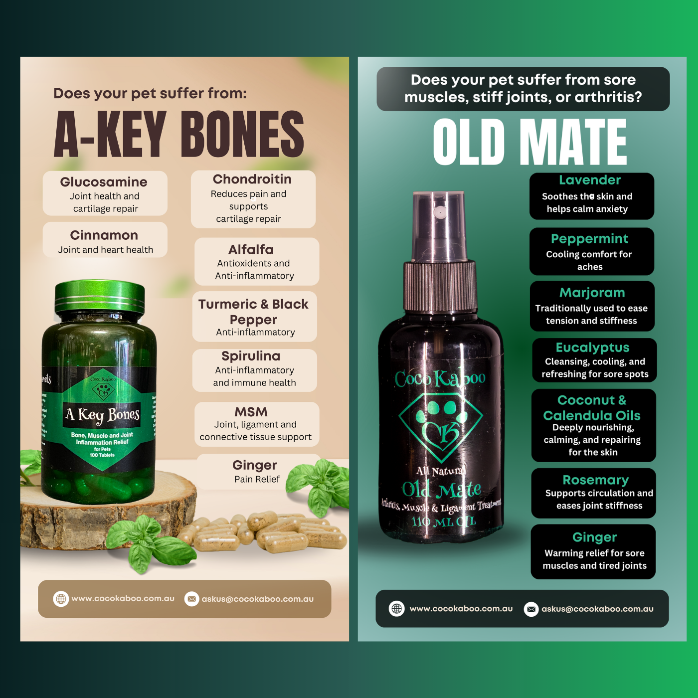 Together, A Key Bones and Old Mate form a complete joint support bundle for dogs – one works from the inside, the other from the outside. By supporting mobility, aiding injury recovery, and promoting hip and joint care, this natural solution helps dogs stay active, comfortable and happy.